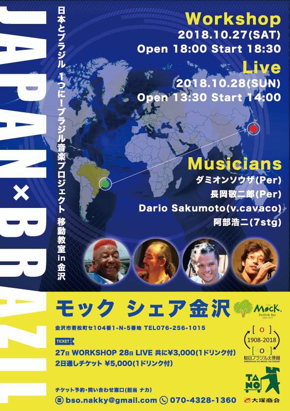 2018年10月27日(土)・10月28日(日)日本とブラジル 一つに!音楽プロジェクト 移動教室@石川県金沢市・モックシェア金沢